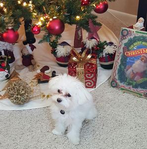 This is our little Baxter who we brought home from your kennel in July. (You had named him Jasper.) He is almost 8 months now and weights 4.8 pounds. He is a joy and deals with anything we put in front of him. He rarely whines, is not a barker and loves attention from everyone. He loves to grab the end of the toilet paper roll and take off in a dead run with it. He also likes being in our camper and takes joy in the neighbors Morkie. He especially loves our grandkids. He slept all night the first night we brought him home with no whining and never had an issue with ordinary household noises. He is content to be in a kennel when needed ( which is seldom) and enjoys having the run of our home. We could not be happier with our new family member. Thank you for having such a wonderful puppy. Baxter wishes you and your family a Happy Holiday and Merry Christmas, Wayne and Diane